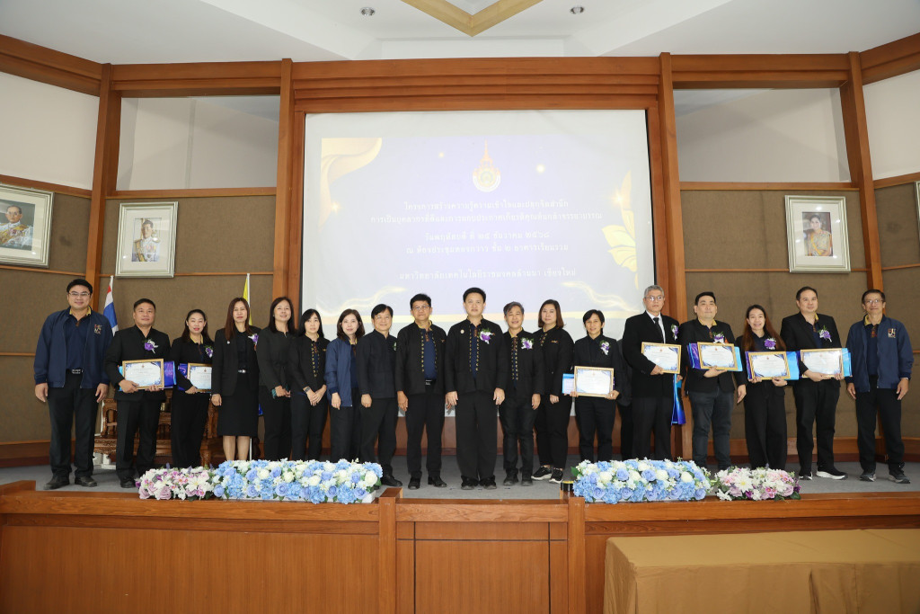 ในการนี้คุณอาริต นาควิโรจน์ นักวิเคราะห์นโยบายและแผน ชำนาญการ บุคลากรของสำนักงานประกันคุณภาพการศึกษา ได้รับรางวัลผู้มีจรรยาบรรณดีเด่น ประเภทผู้มีจรรยาบรรณต่อตนเองและวิชาชีพ โดยมีอธิการบดีมหาวิทยาลัยเทคโนโลยีราชมงคลล้านนา ให้เกียรติมอบเกียรติบัตรประกาศเกียรติคุณ เมื่อวันที่ 25 ธันวาคม 2568 ณ ห้องประชุมทองกวาว มทร.ล้านนา